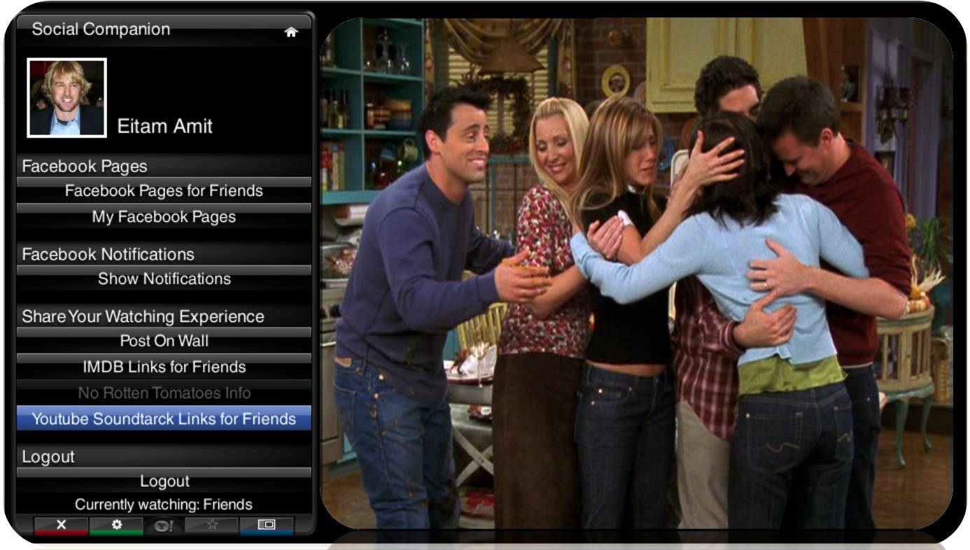 This application was called the Social Companion, and it was developed in one semester by two bright Technion students, Eitam Amit and Roy Velich, under my supervision together with my colleague Amit Kagian. I must say that Eitam and Roy did an outstanding work, learning in a short time how to develop applications for Connected TV, combining content from multiple sources and proposing several additional features to our initial concept. You can check their project site for more information, and see below a screen shot of the Social Companion application.