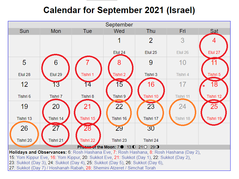 You can see below my calendar for the month of September 2021. Marked with circles, are the Jewish Holidays we had in this month: Rosh HaShana (the Jewish New Year), Yom Kippur, Sukkot and Simchat Torah. The red circles are the days I did not work (including Shabbat), and the orange circles are the days I have worked only partially.